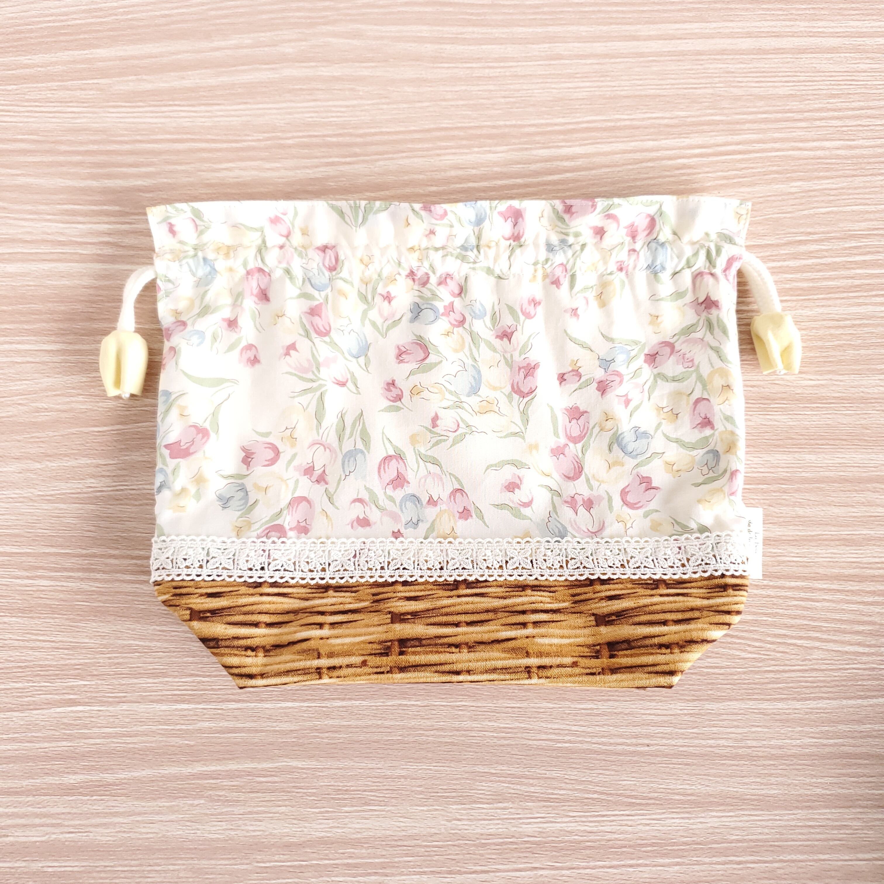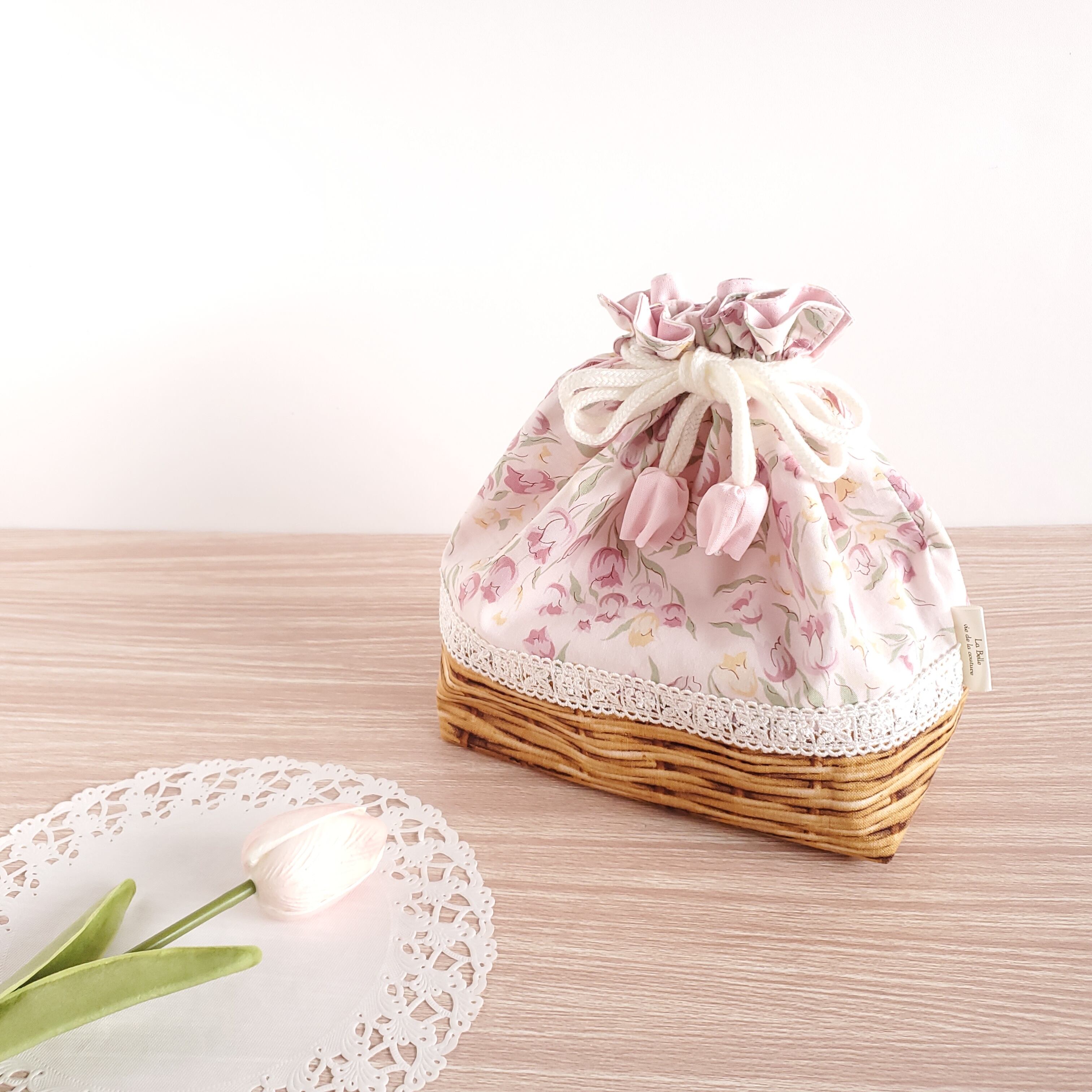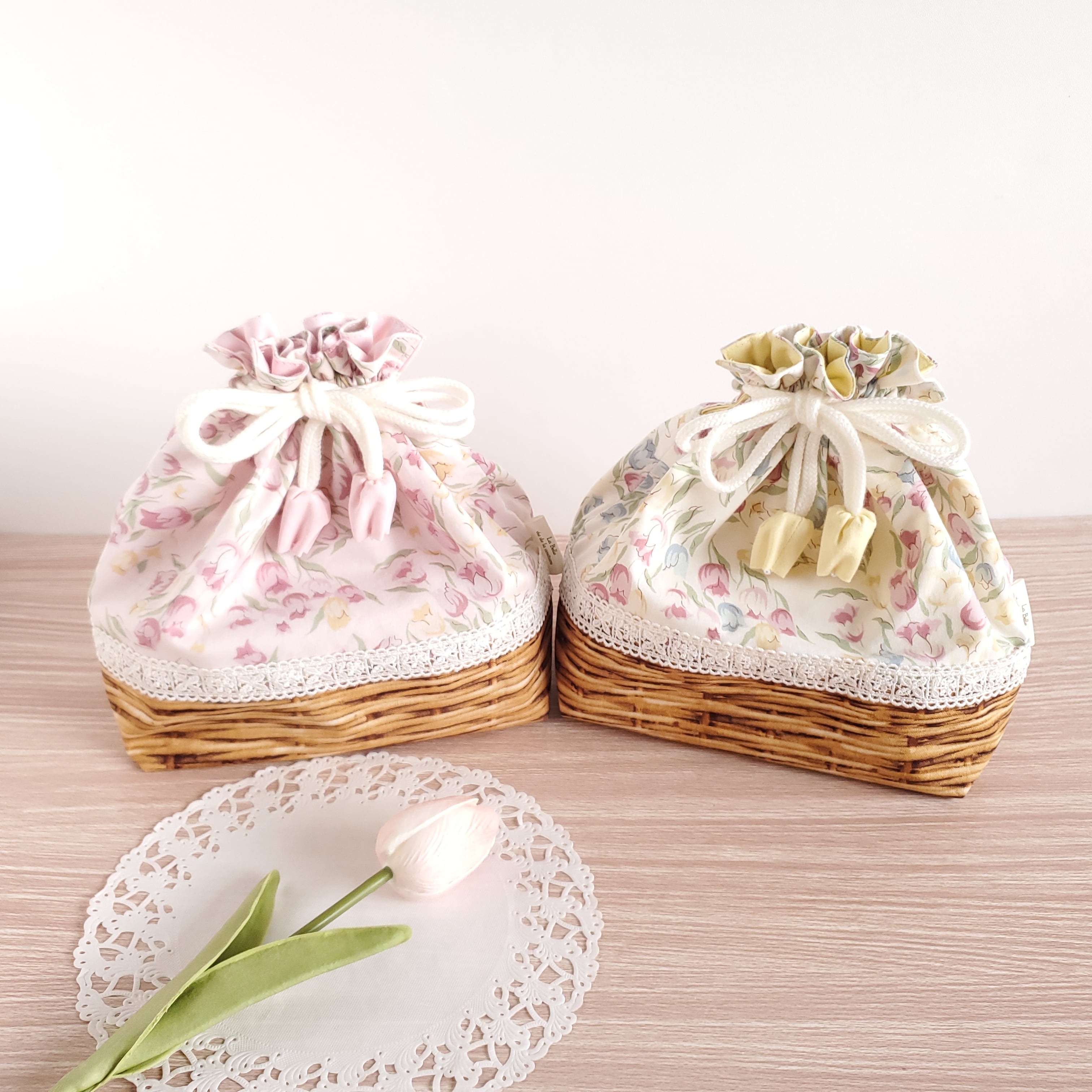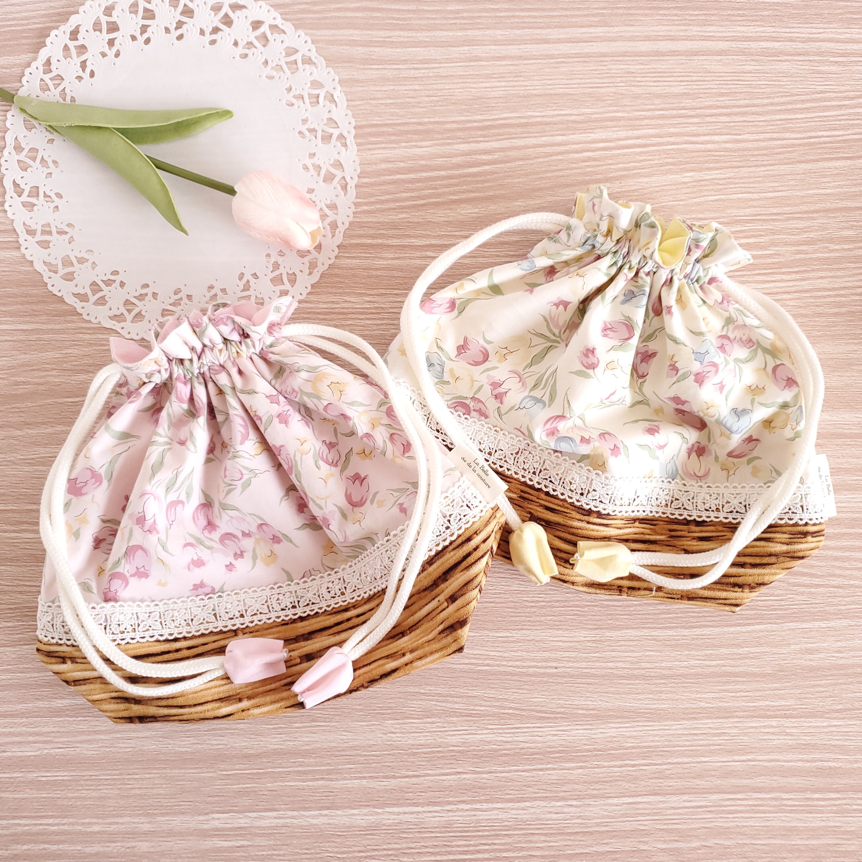 可愛いチューリップが描かれた淡い色の薄手コットンと、カゴ柄のコットン生地で仕立てました。