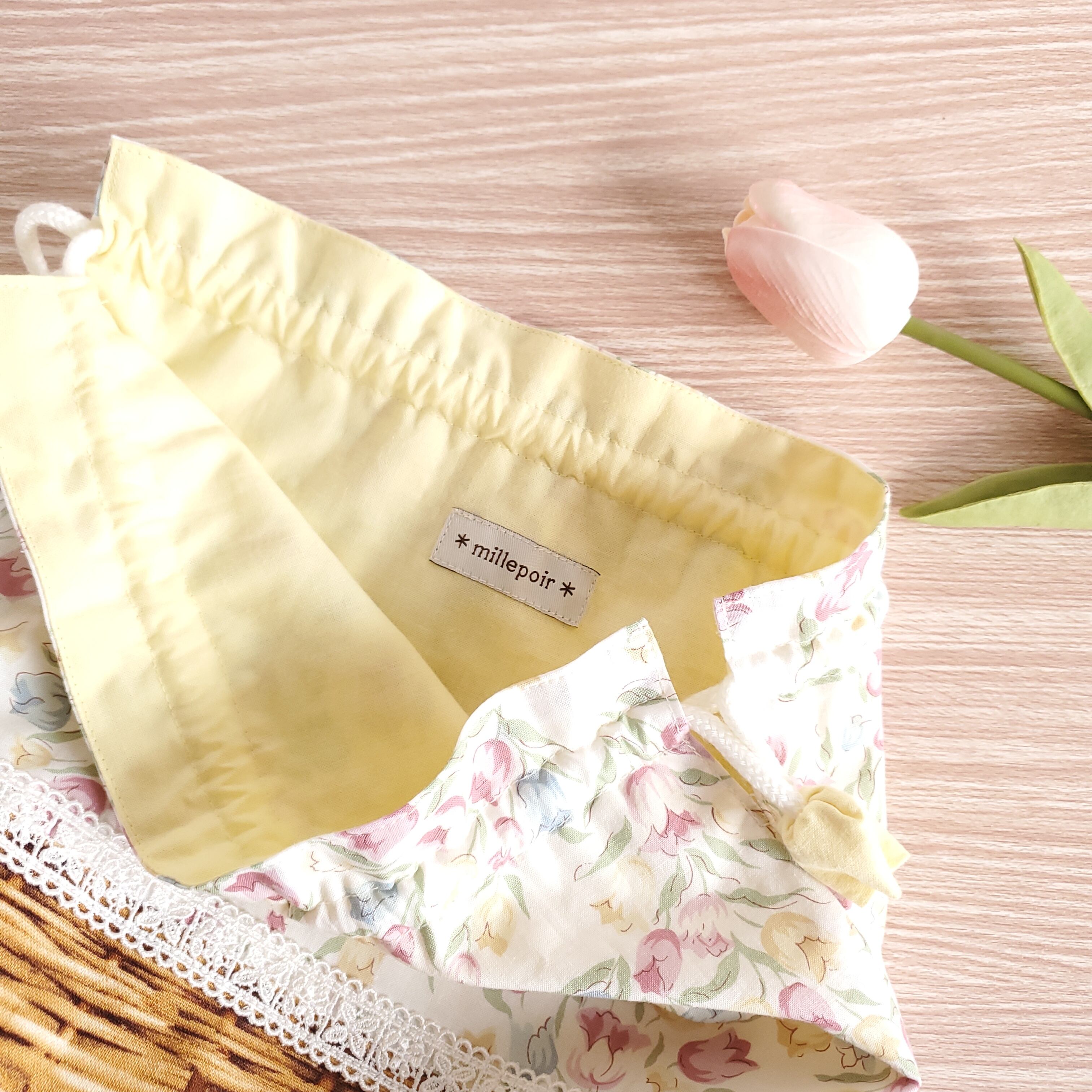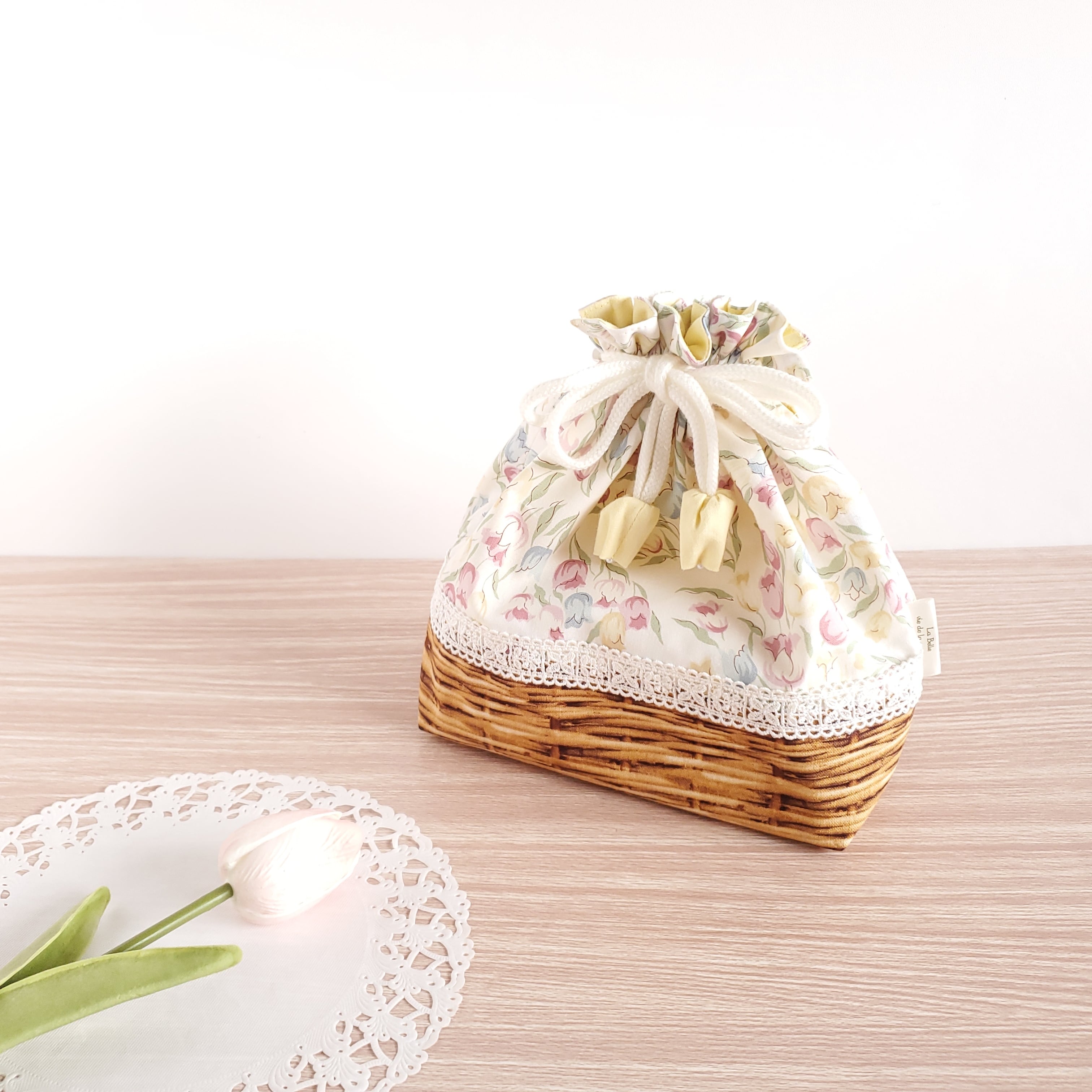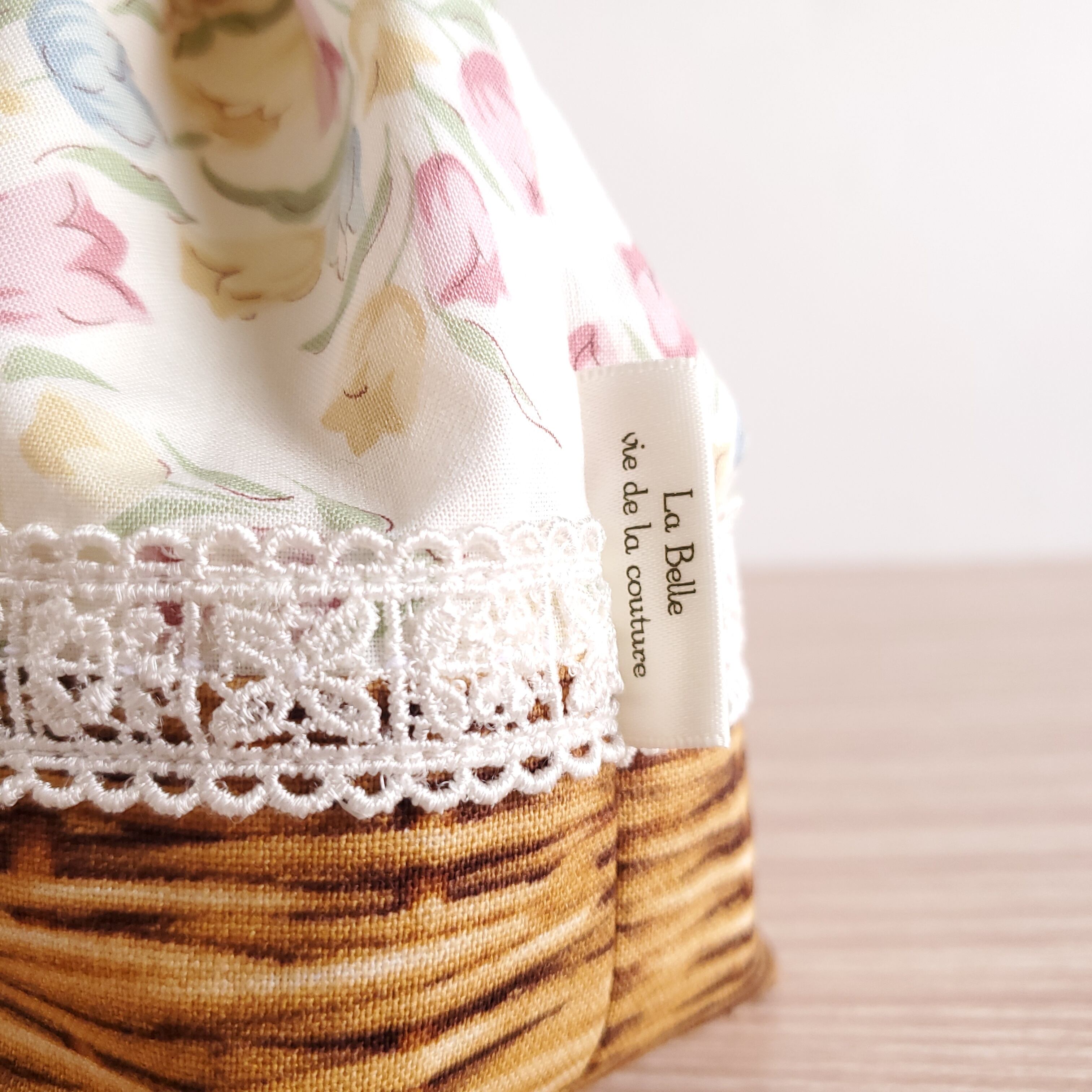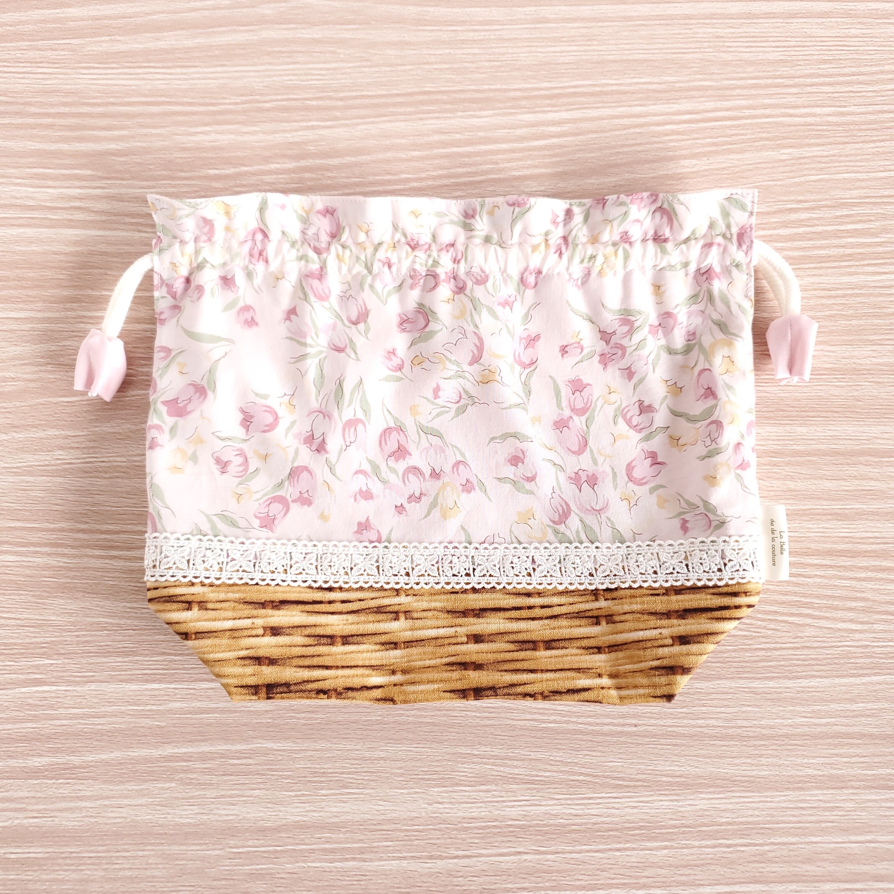 可愛いチューリップが描かれた淡い色の薄手コットンと、カゴ柄のコットン生地で仕立てました。