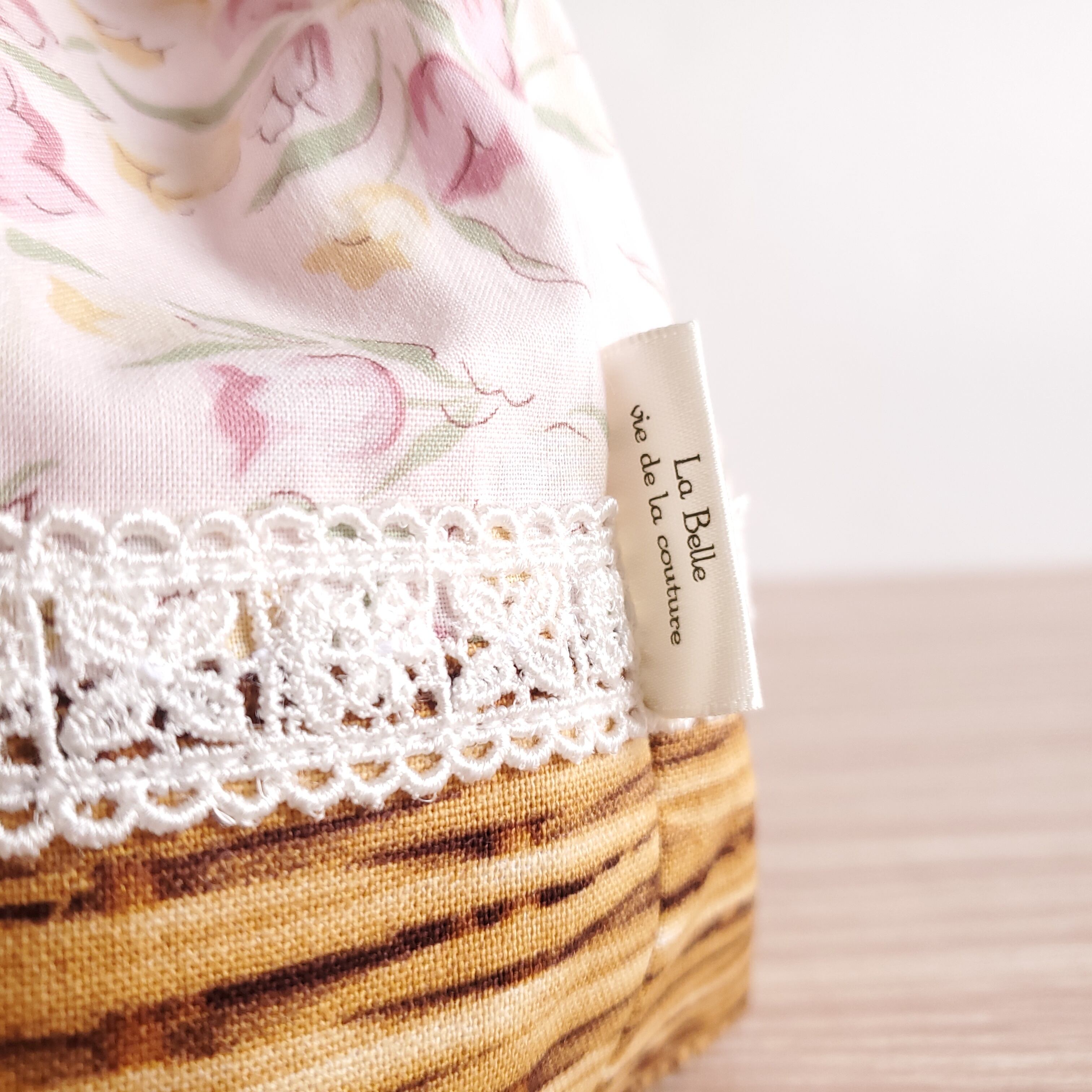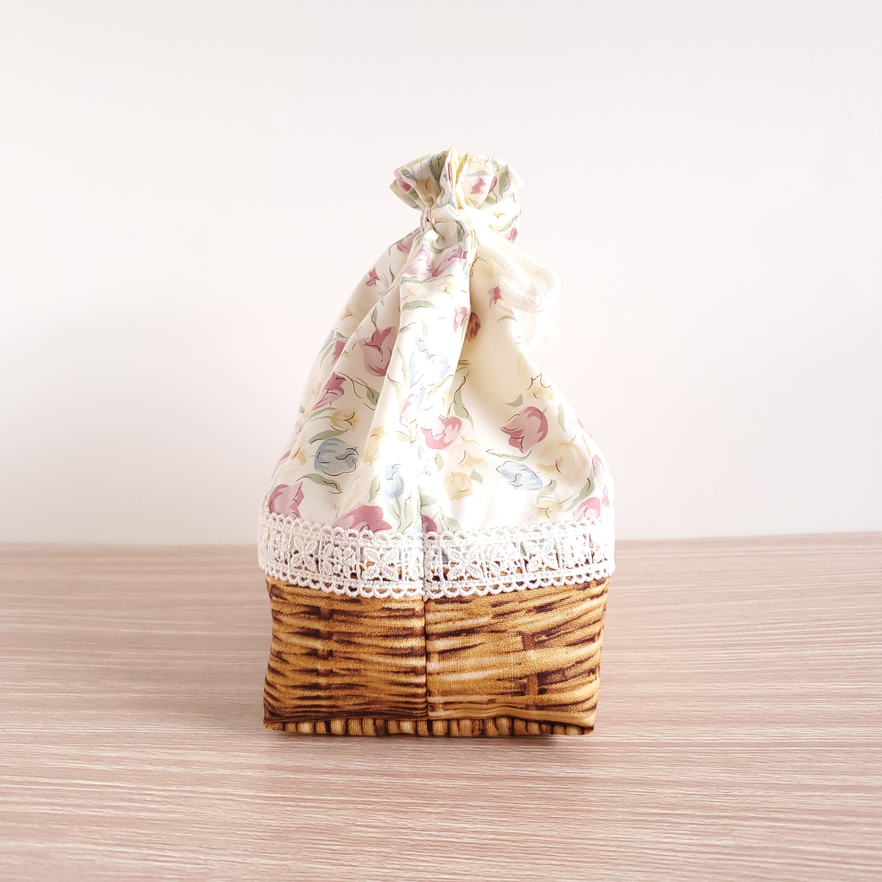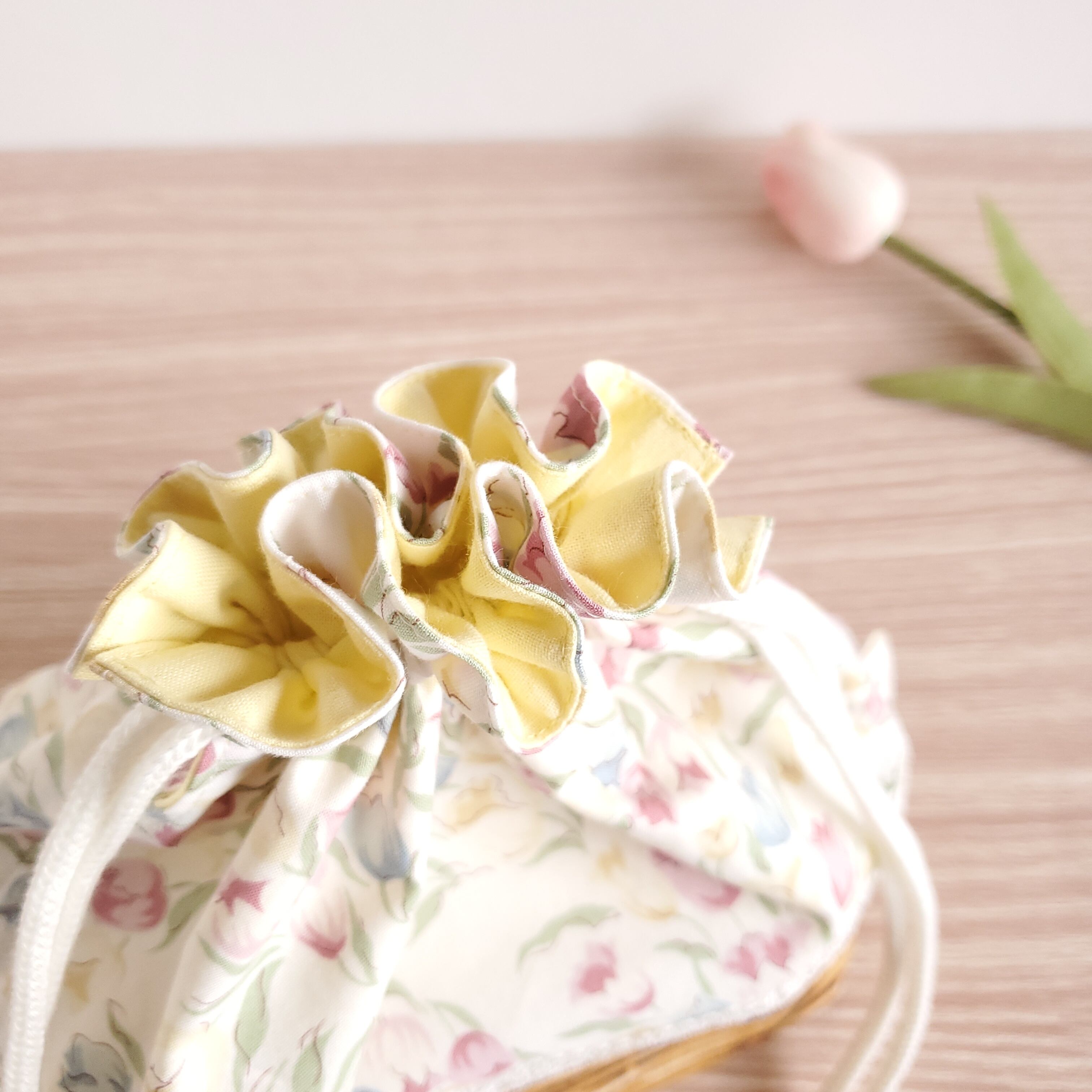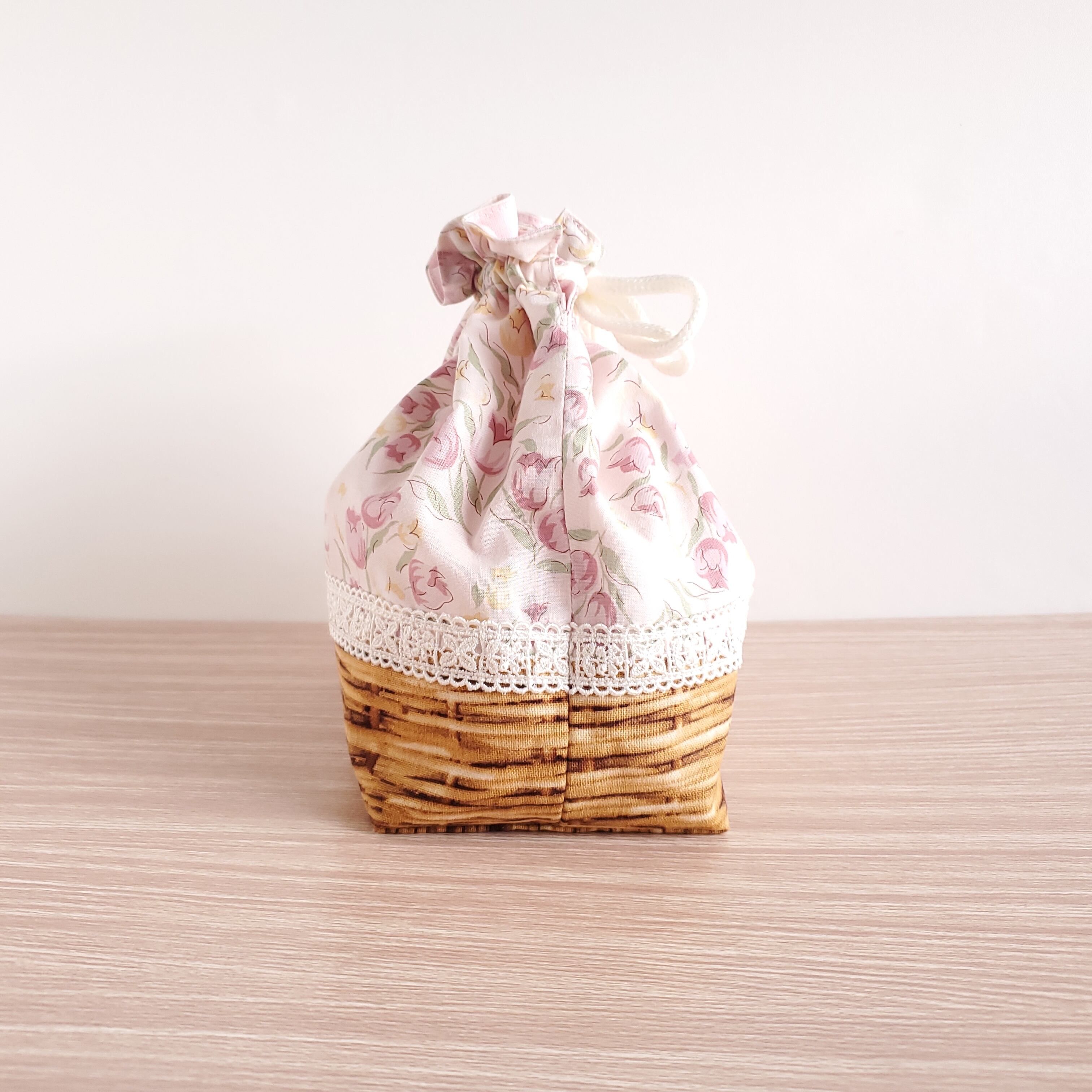 可愛いチューリップが描かれた淡い色の薄手コットンと、カゴ柄のコットン生地で仕立てました。