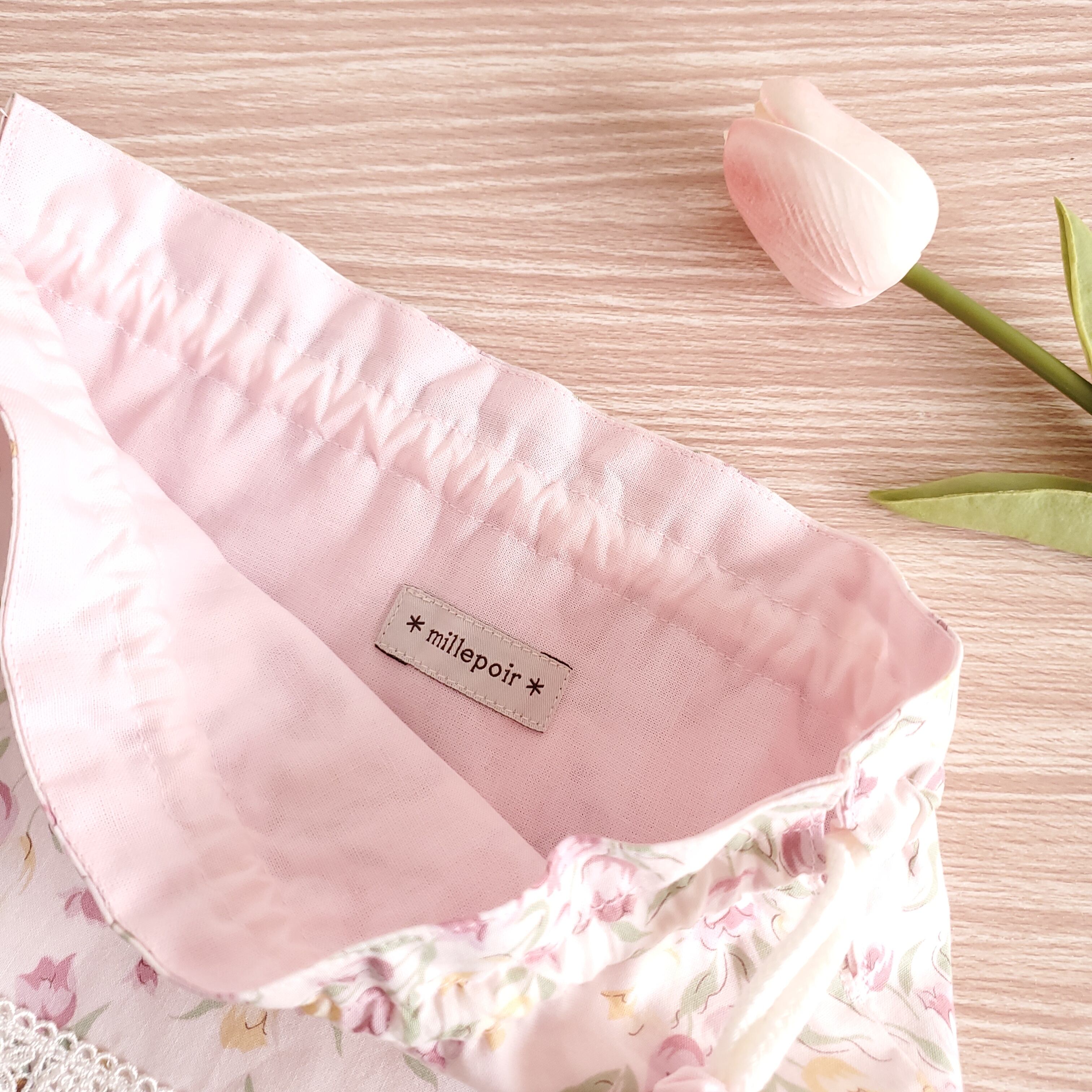 紐を絞るとフリルになるように仕立てたので、裏地が少し見えて可愛いです。