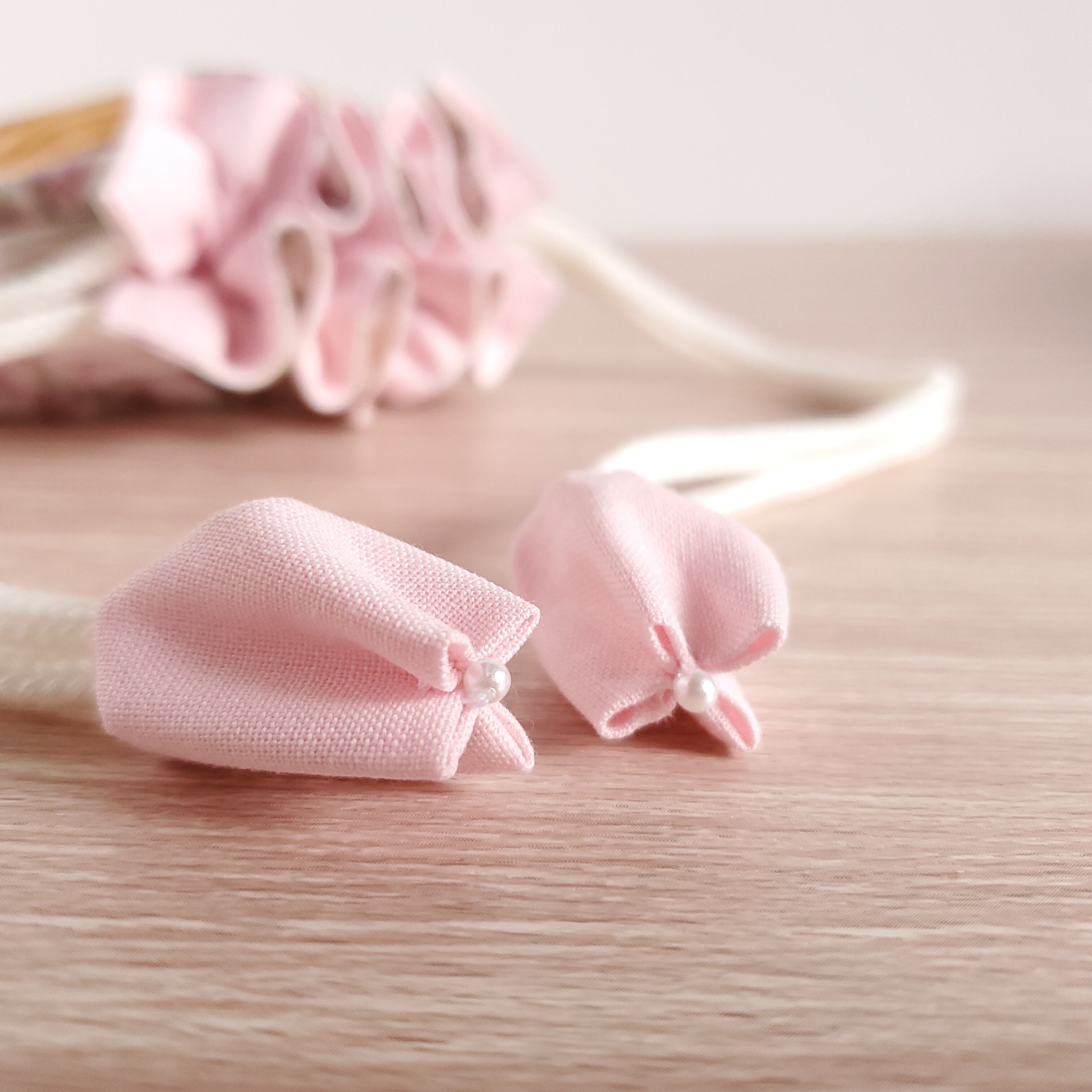 ループエンドの代わりに、ヒモの先に咲かせたチューリップのお花のような飾りがポイントです。